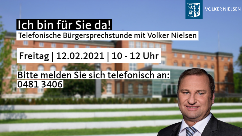 Die Bürgersprechstunde findet am Freitag, den 12.02.2021 von 10-12 Uhr statt. Aus organisatorischen Gründen und um unnötige Wartezeiten zu vermeiden, ist eine vorherige Anmeldung per Telefon unter 0481 3406 oder per Email an nielsen.ma01 [at] t-online.de nötig.